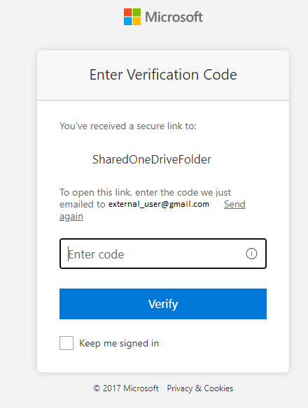 - Als het externe adres NIET bekend is bij Microsoft, krijgt de externe gebruiker na verificatie van het e-mailadres een verificatiecode toegestuurd die hij moet invoeren in het verificatievenster. Na het invoeren van deze code wordt de gebruiker doorgestuurd naar de gedeelde locatie.