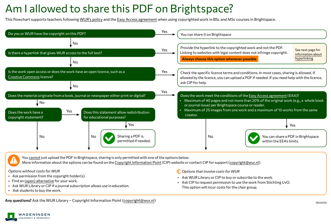 Het delen van een PDF in Brightspace is niet altijd toegestaan. WUR beleid is om een hyperlink te gebruiken waar mogelijk. Het onderstaande stroomschema helpt je met de juiste keuze (alleen Engels).