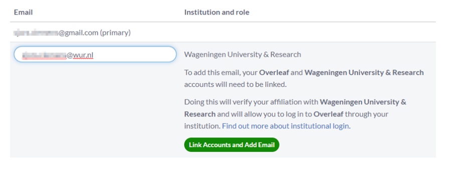 Als je een account hebt aangemaakt met bijvoorbeeld je persoonlijke Hotmail- of Gmail-adres, kun je nog steeds gebruikmaken van het WUR-abonnement op Overleaf.