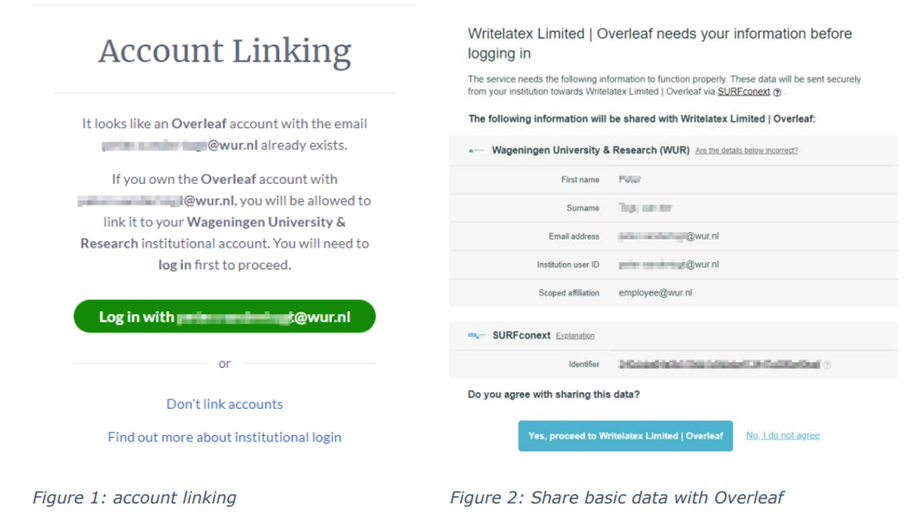 - Voer je WUR-e-mailadres in. Als dit e-mailadres al wordt gebruikt voor een Overleaf-account, wordt je gevraagd of je een koppeling wilt maken met je bestaande account of een nieuw account wilt aanmaken (afbeelding 1).