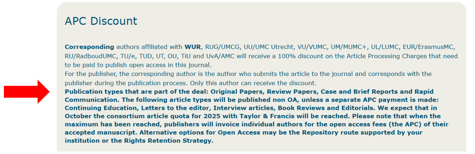 - een overeenkomst met de uitgever en een deel van de APC komen aan bod: bijv. 57% APC-korting voor WUR-auteurs