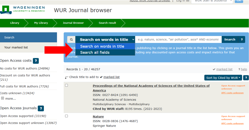 Optie 1: Zoek op een specifiek tijdschrift. Gebruik ‘Search on words in title' in het dropdown-menu en voer de titel van het tijdschrift in. Nadat je op 'Search' hebt geklikt, zie je in de WUR Journal Browser de link ‘Do you mean the journal…'? net onder het zoekvak. Je kunt op die link klikken of door de zoekresultaten bladeren.