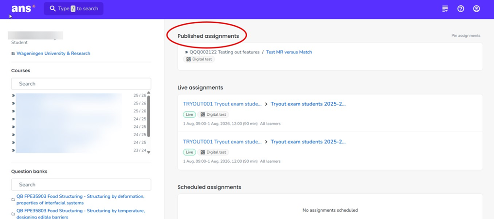 Als de student is ingelogd, wordt het dashboard of startscherm in Ans getoond. Bovenin onder Published assignments (NL: Gepubliceerde toetsen) staan de beschikbare toets resultaten open die studenten kunnen inzien.