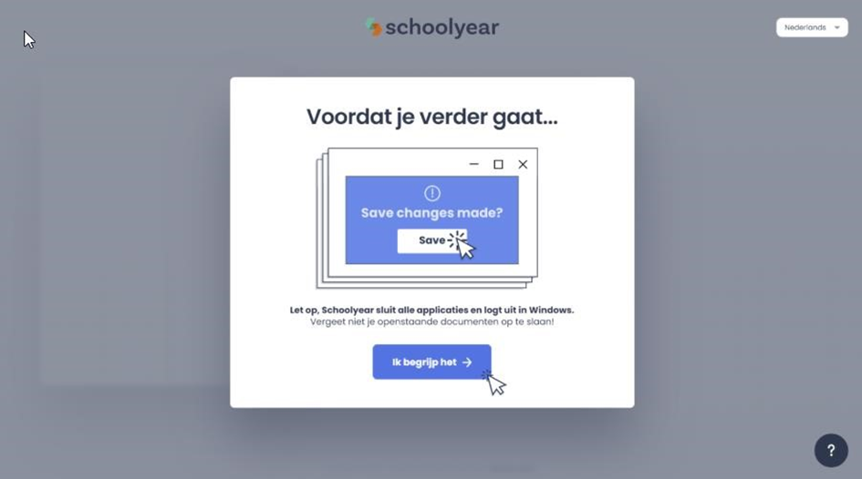 Bij het opstarten van Schoolyear worden alle applicaties en geopende bestanden afgesloten.