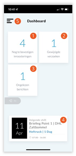 Als u bent ingelogd in de app ziet u als eerste het ‘Dashboard’. Dat scherm geeft overzicht over de belangrijkste zaken: