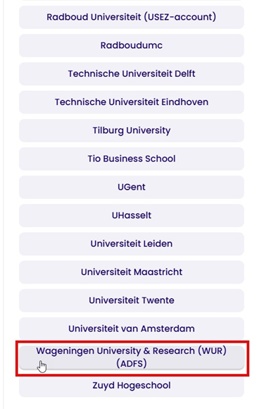 Zorg dat de student de juiste instelling uit de lijst selecteert: Wageningen University & Research (WUR) (ADFS).