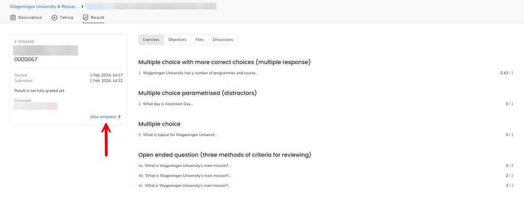 - Soms is het onduidelijk waar een student zijn gegeven antwoorden, vragen en modelantwoorden kan inzien. Als de student het toetsresultaat opent wordt onderstaande pagina weergegeven. Klik dan altijd op View answers, zie afbeelding hieronder: