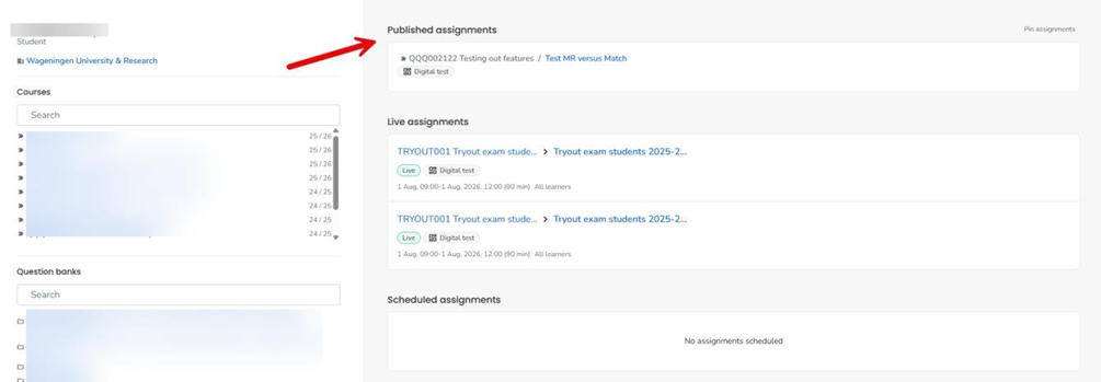- Student ziet zijn resultaat niet in de lijst. Het komt vaak voor dat studenten hun tentamenresultaat openen onder de Live assignments in. Een toetsresultaat moet altijd worden geopend in de lijst onder Published assignment. Zie afbeelding hieronder, bij de rode pijl.
