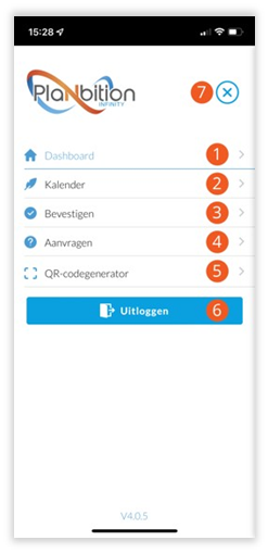 Het menu van de app is bereikbaar met het icoon linksboven met drie liggende zwarte streepjes (z.g. Hamburgermenu). Hier vind u de volgende opties: