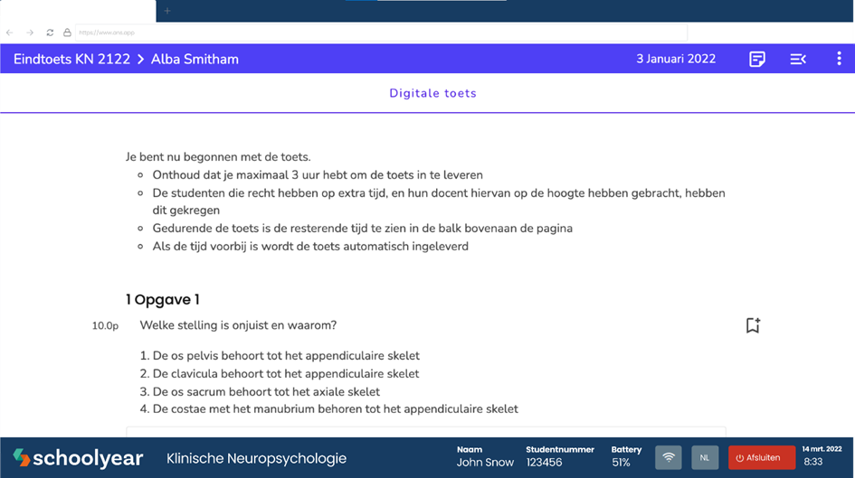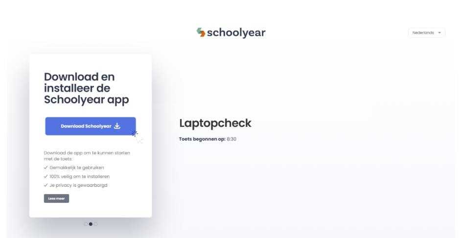 Net als bij een examen, wordt op het moment dat de student op het toets resultaat klikt ook de applicatie Schoolyear opgestart, of gedownload indien Schoolyear niet op de laptop van de student is geïnstalleerd. Schoolyear is een beveiliging die er voor zorgt dat studenten alleen de website Ans kunnen opstarten en geen andere websites kunnen openen of bij hun persoonlijke bestanden kunnen.
