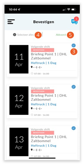 In het bevestigen menu staan alle diensten die u nog moet bevestigen. Door te bevestigen weten we dat u (de wijziging van) de dienst hebt gezien en ook daadwerkelijk kan. Als u niet van tevoren de dienst hebt bevestigd nemen we contact met u op om er zeker van te zijn dat u weet dat u een dienst hebt. Mocht het zo zijn dat we u dan ook niet kunnen bereiken, dan kan het zijn dat je weer wordt uitgepland. Het bevestigen van diensten doet u zo: