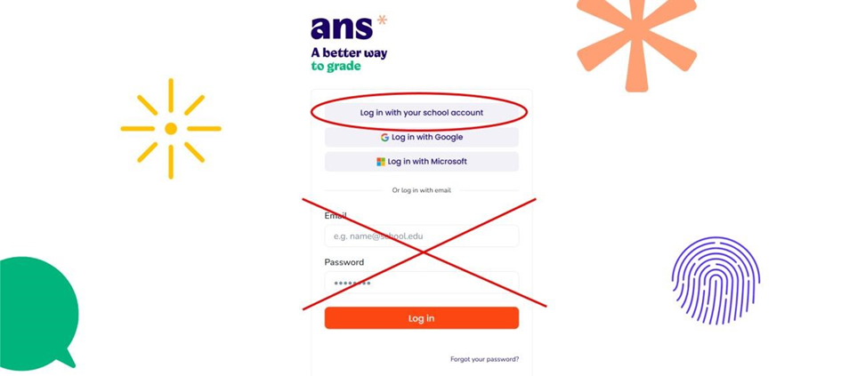 Studenten openen op hun laptop een browser en gaan naar de website ans.app. Daar loggen ze in door op de knop Log in with your Schoolaccount te klikken. Let er op dat studenten niet met hun emailadres en wachtwoord inloggen of naar de website van Schoolyear gaan!