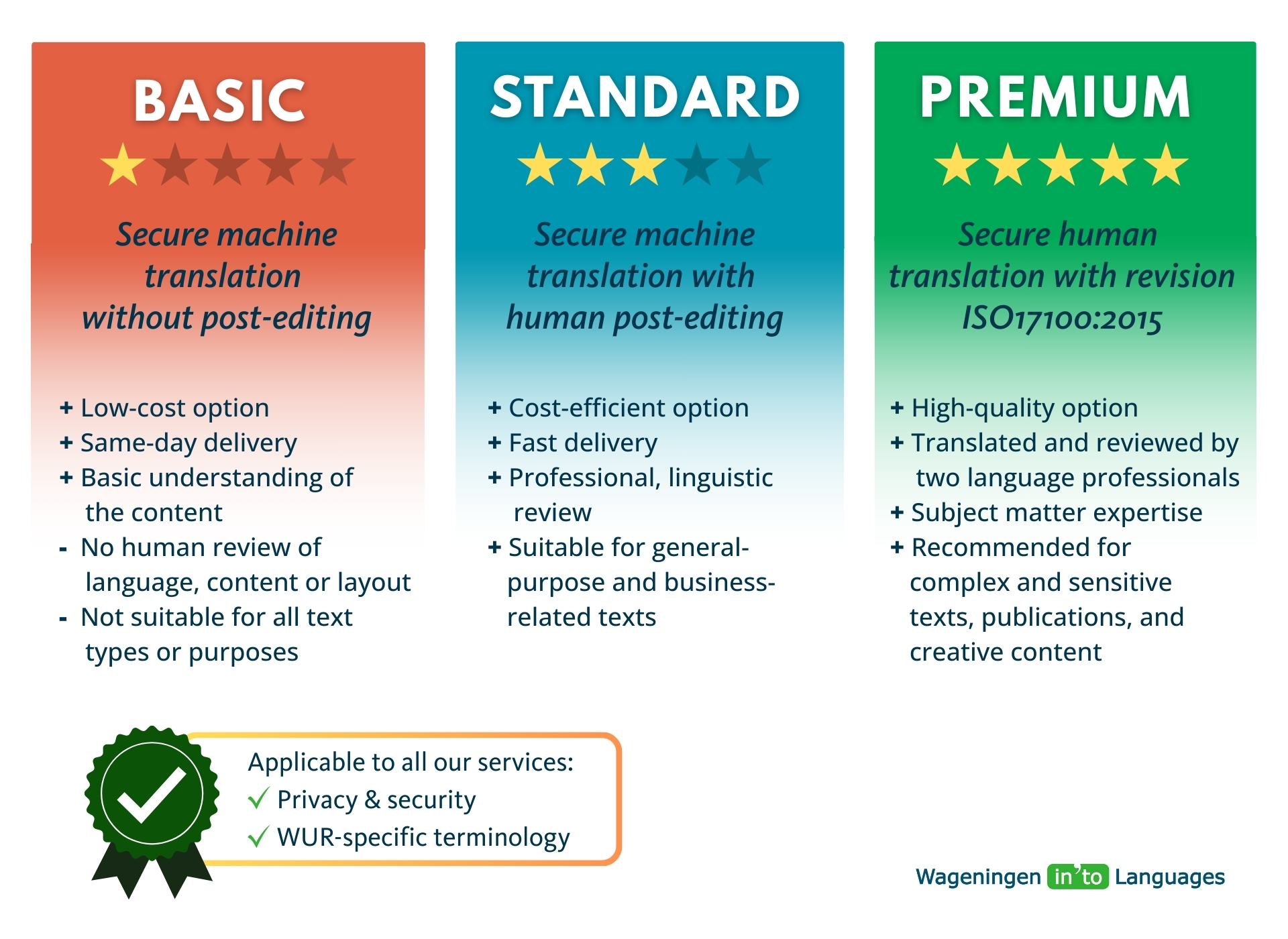 Will the text be shared more widely and do you want to make sure the translation is correct and easy to read, without distracting errors? Then a STANDARD translation (Secure machine translation with human post-editing) is a smart choice. At a greatly reduced rate, a professional native language translator checks the machine translation and refines it where necessary.