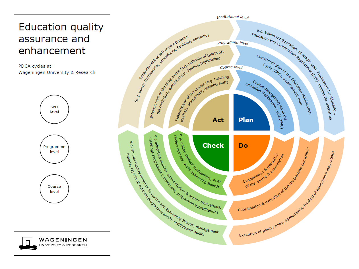 The interactive infographic (see attachment) Educational quality assurance and enhancement provides a visual summary of the different PDCA-cycles at WU-, programme-, and course level, and the instruments and actors involved at each level.